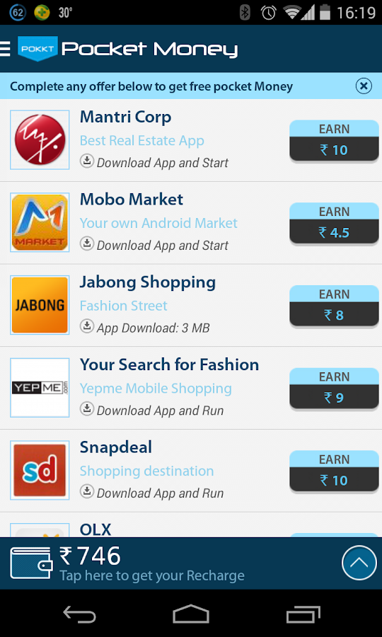 POKKT is another great app, which helps you to earn free recharges, though the download of other apps, its simple User interface makes it extremely easier to use.
